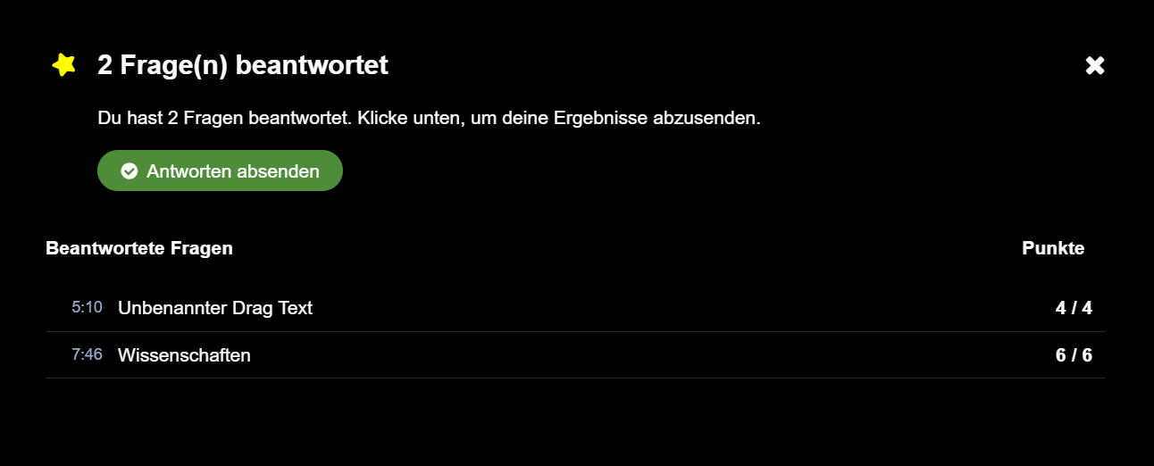 Video-Lerneinheiten werden dann immer wieder von Fragen und Quizzen unterbrochen, die sicherstellen sollen, dass der vermittelte Stoff verstanden wurde. Zum Ende eines Video erscheint ein schwarzes Fenster. Bitte achten Sie unbedingt darauf, dass die Antworten abgesendet werden MÜSSEN, damit diese bewertet werden und Sie mit dem Kurs fortfahren können. So sieht das Fenster aus: