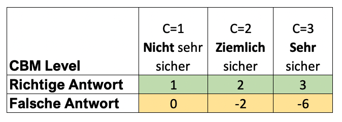 Die Lernaktivität Lernen-mit-Fragen setzt sich aus einem Test mit 10 zufälligen Quiz-Fragen zusammen, die Ihnen über ein ausführliches Feedback noch einmal ein vertiefendes Verständnis zu den Inhalten geben soll. Sie müssen zu jeder Frage angeben, wie sicher Sie sich mit der Beantwortung sind. Diese Methode heißt Certainty-Based-Marking (CBM). Folgendes Bewertungsschema liegt dem zugrunde: