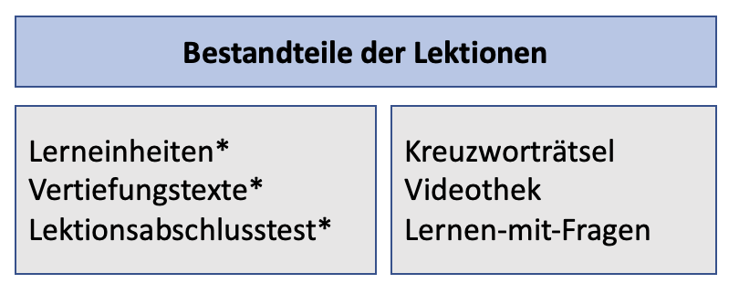 Die Lektionen und ihre Lerneinheiten bauen aufeinander auf. Sie werden chronologisch freigeschaltet, sobald eine vorangegangene Kursaktivität abgeschlossen wurde.